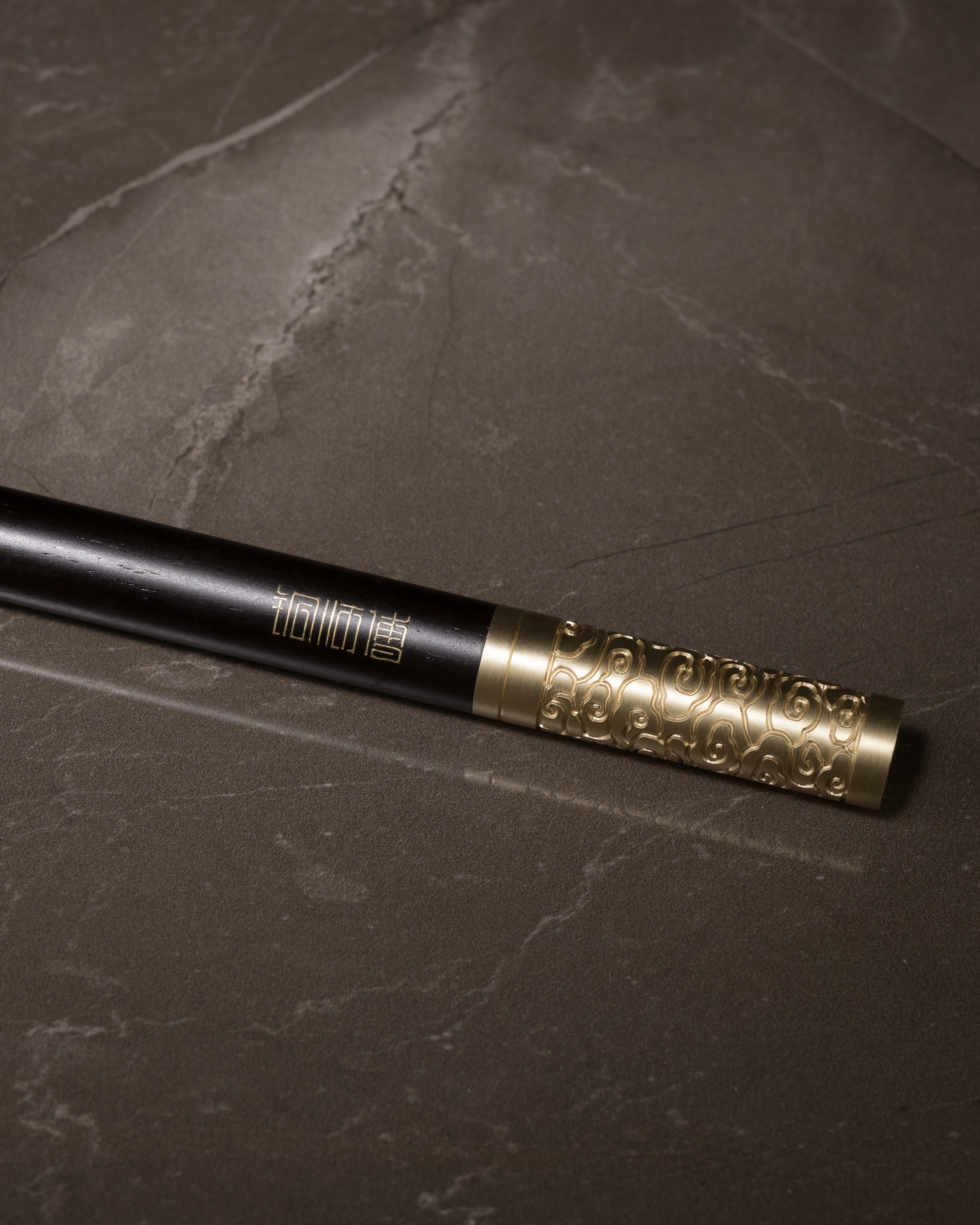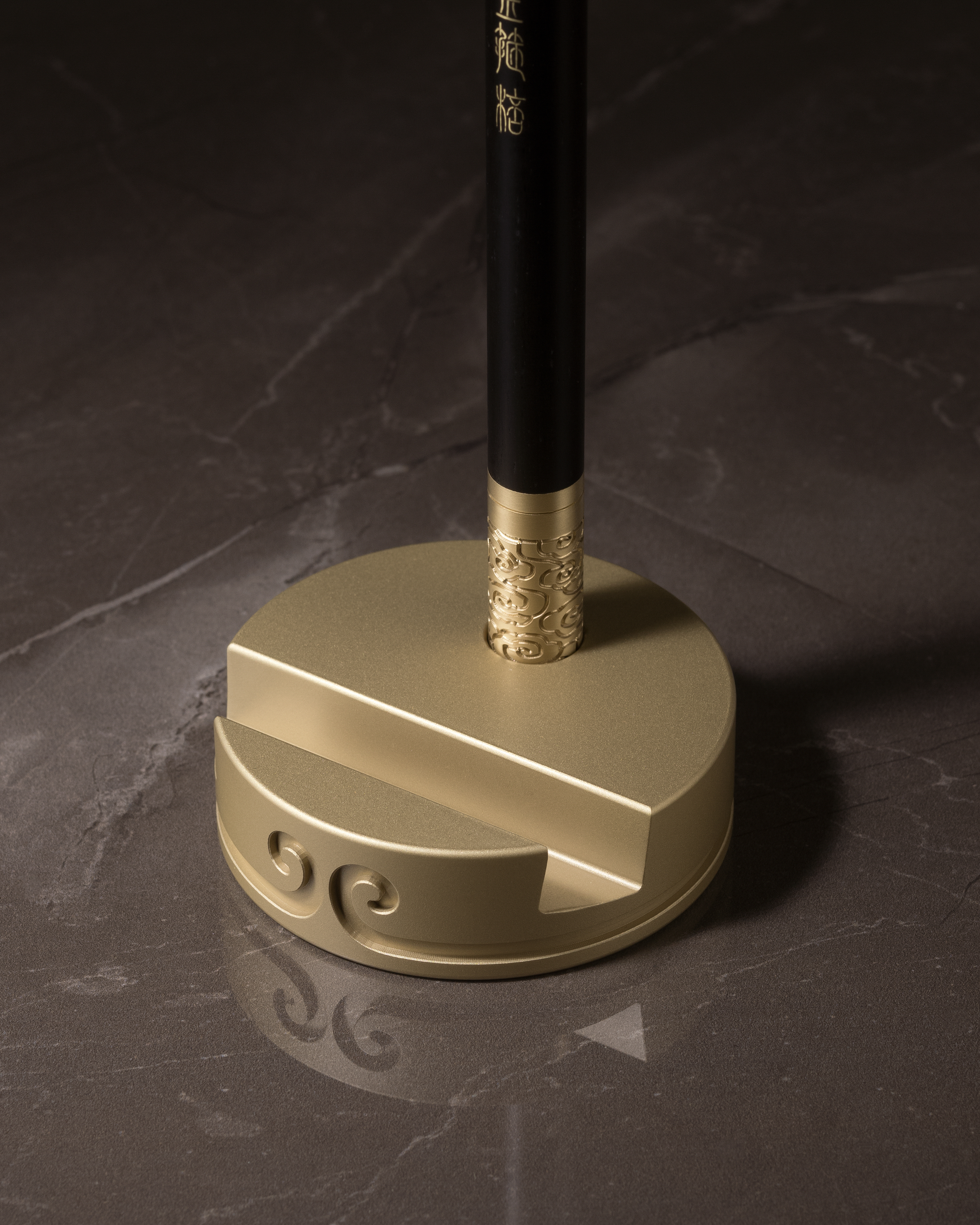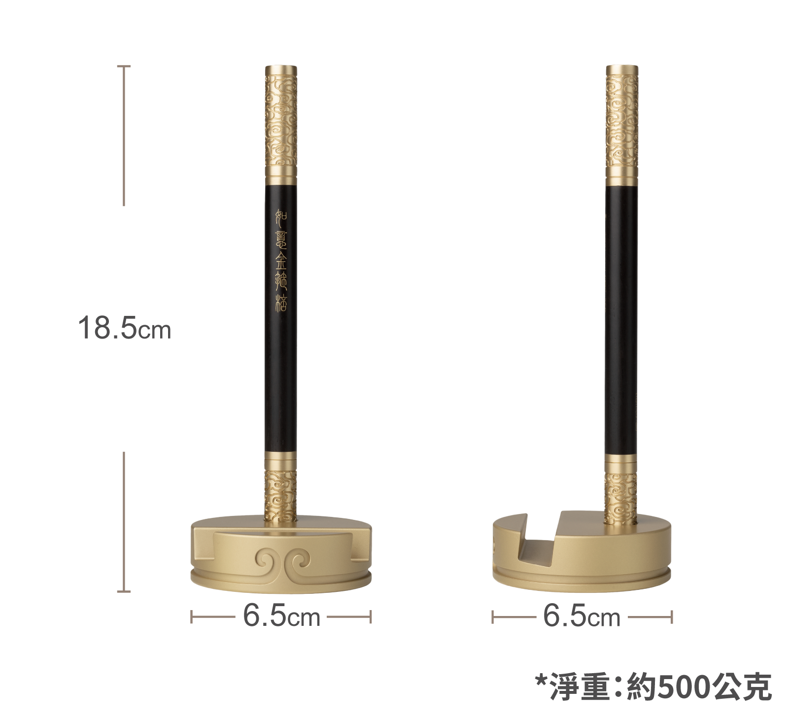 銅師傅匠心原創設計作品,以黃銅與黑檀木詮釋經典;巧妙將手機支架與原木筆二合為一,以細銅絲將篆書「如意金箍棒」掐嵌入木,附上一共7支得力簽字筆芯,搭配實心黃銅底座,橫豎擺放皆宜