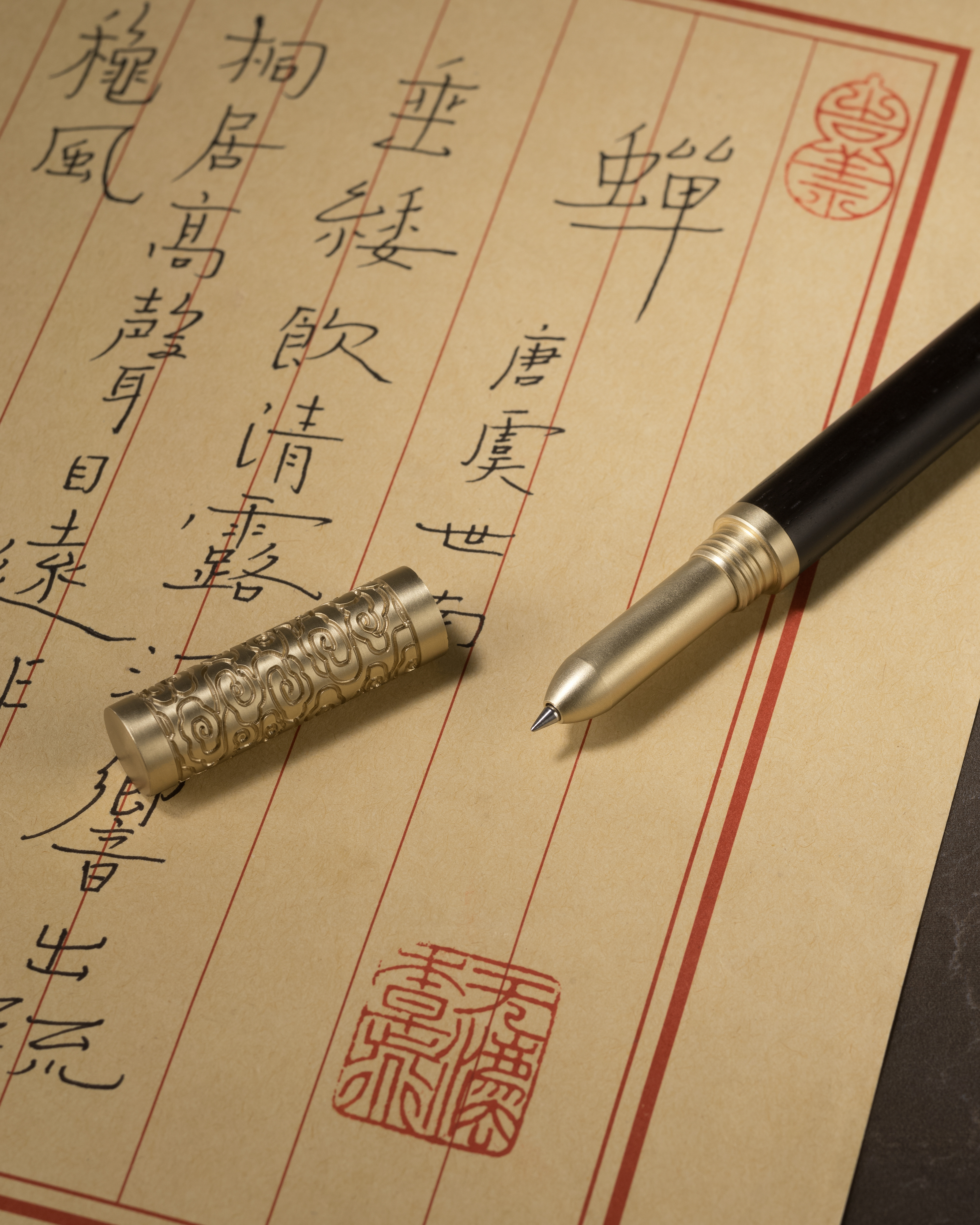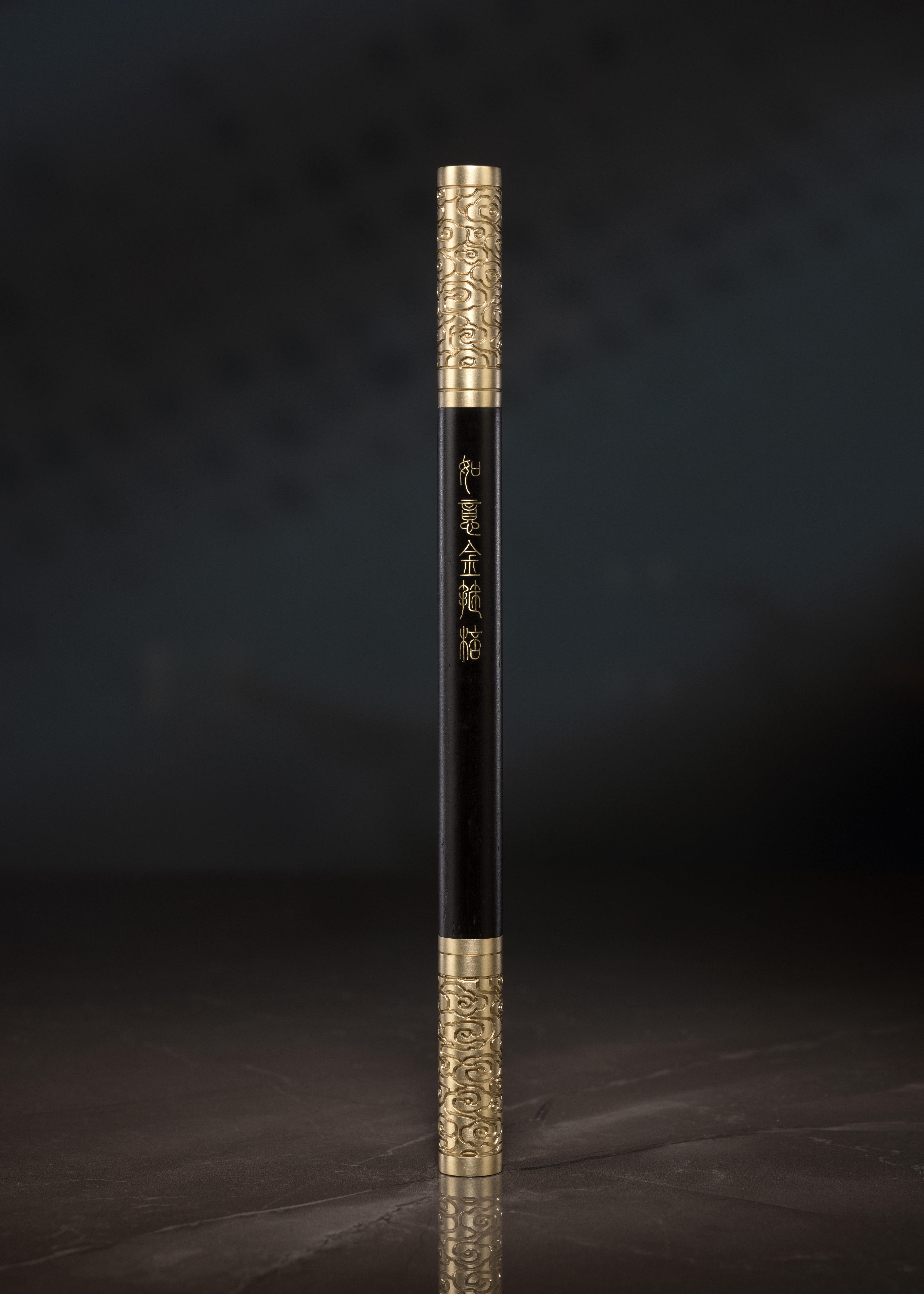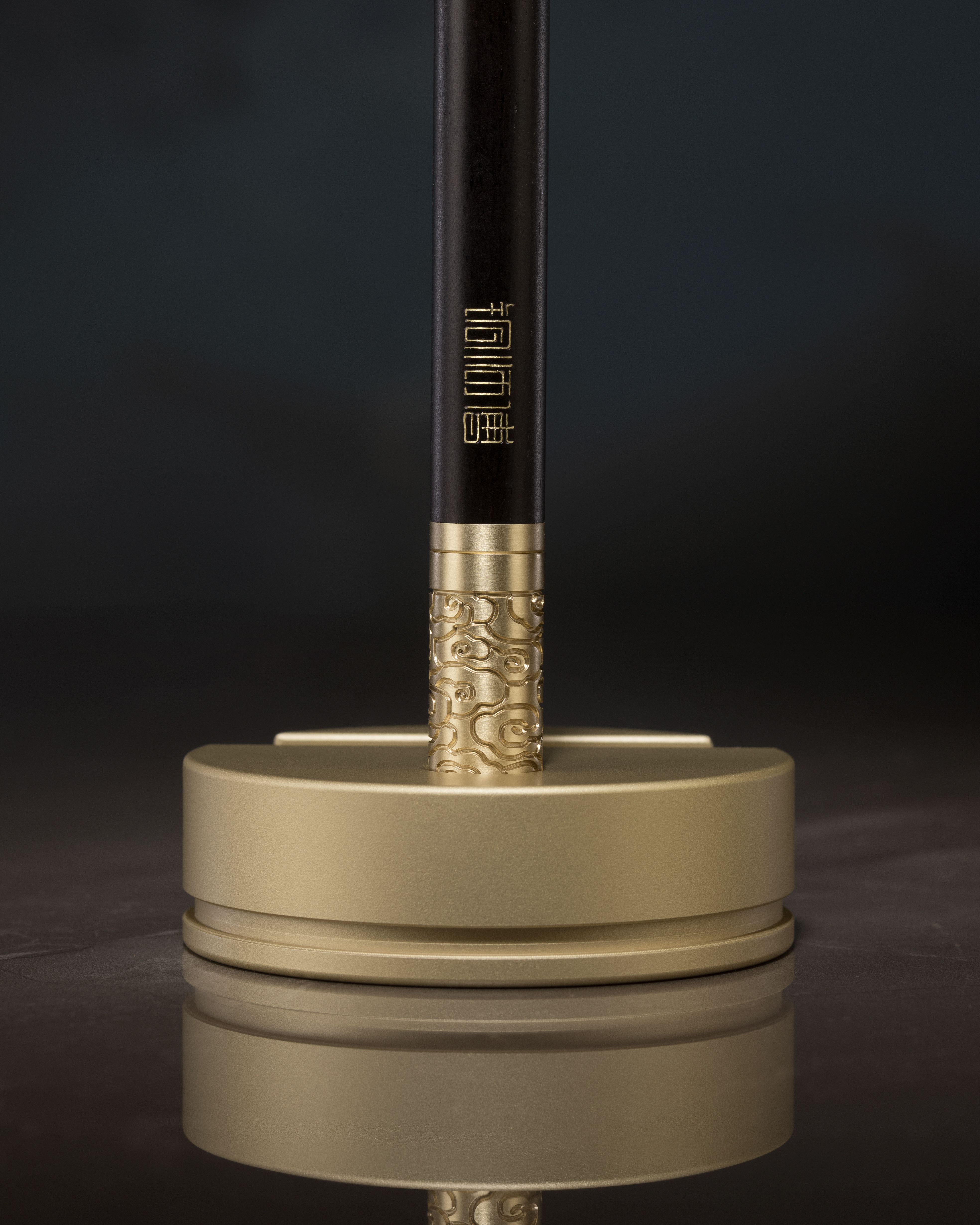 銅師傅匠心原創設計作品,以黃銅與黑檀木詮釋經典;巧妙將手機支架與原木筆二合為一,以細銅絲將篆書「如意金箍棒」掐嵌入木,附上一共7支得力簽字筆芯,搭配實心黃銅底座,橫豎擺放皆宜