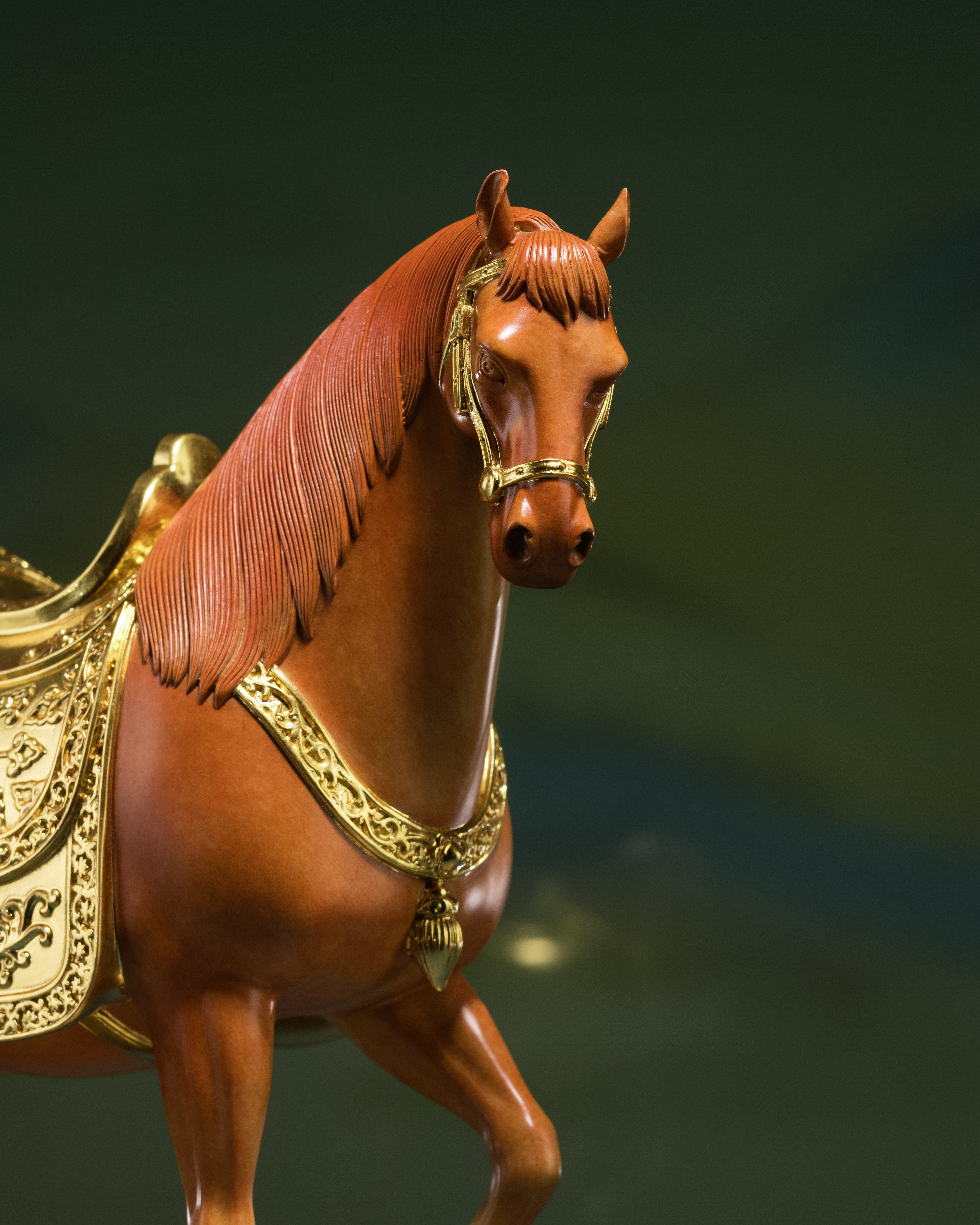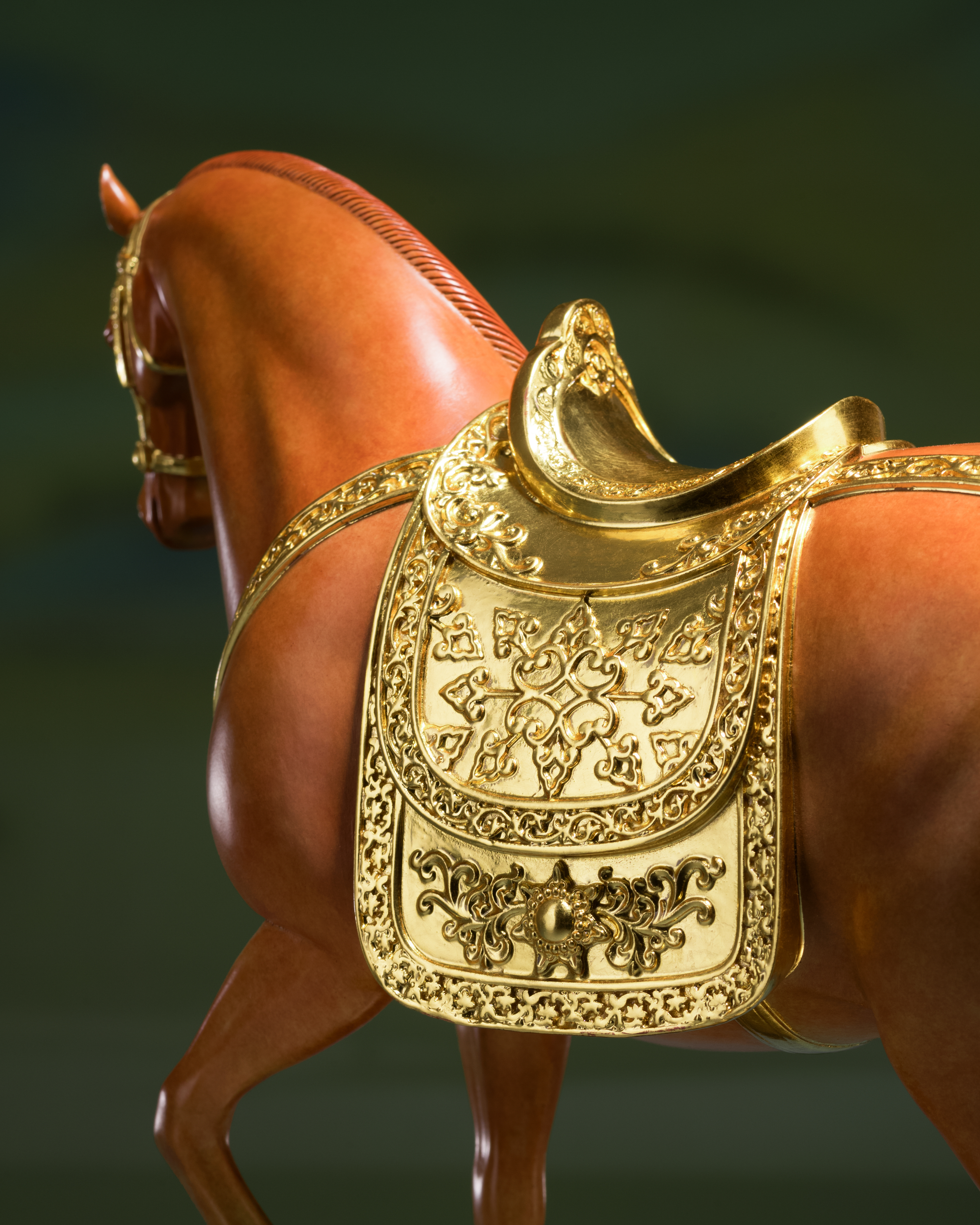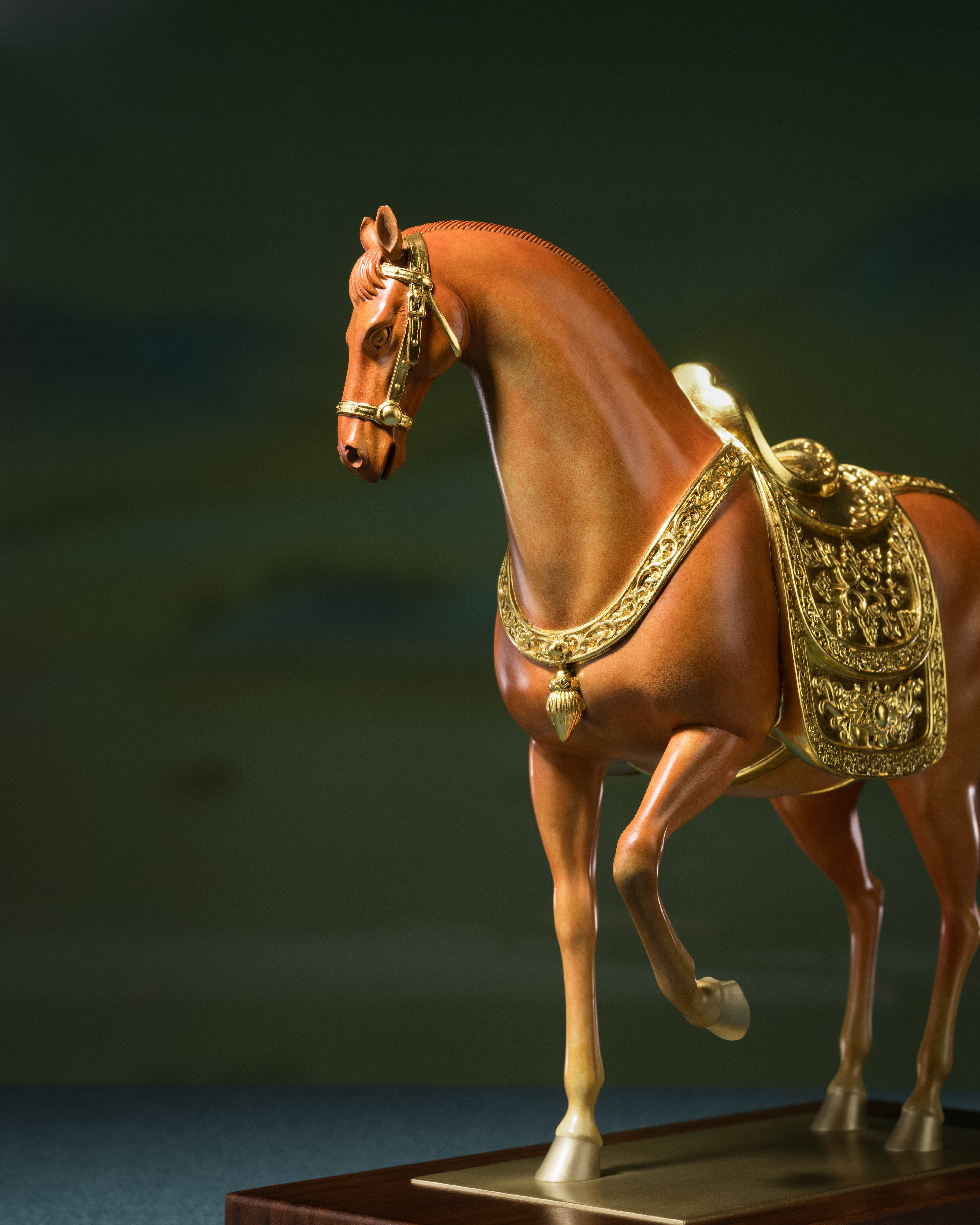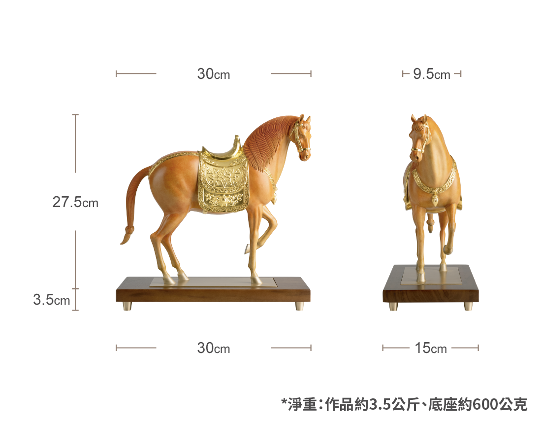 馬鞍、韁繩配件等金色部分,均以24K真金金箔貼製,搭配設計巧妙的銅腳木底座,更加精緻
