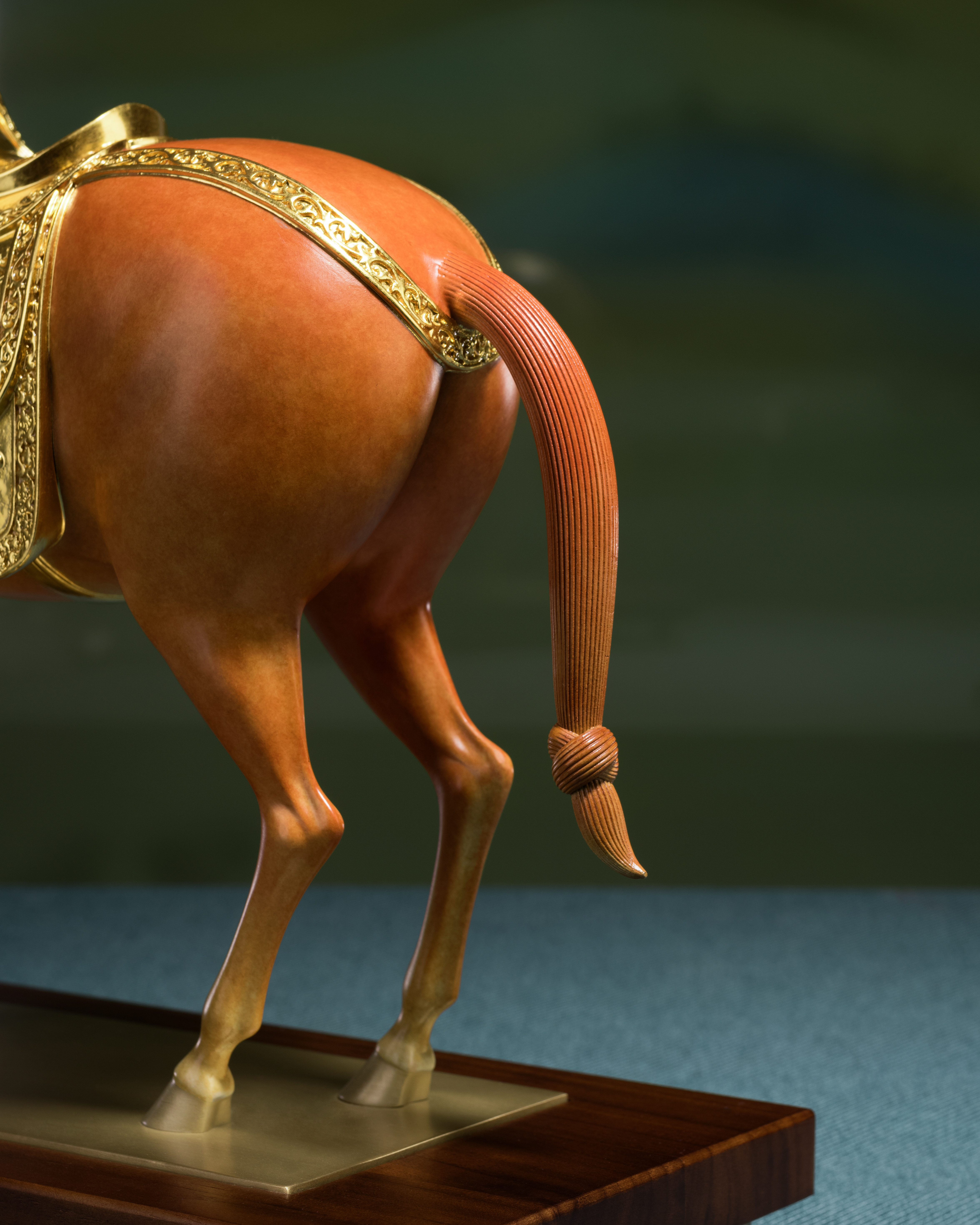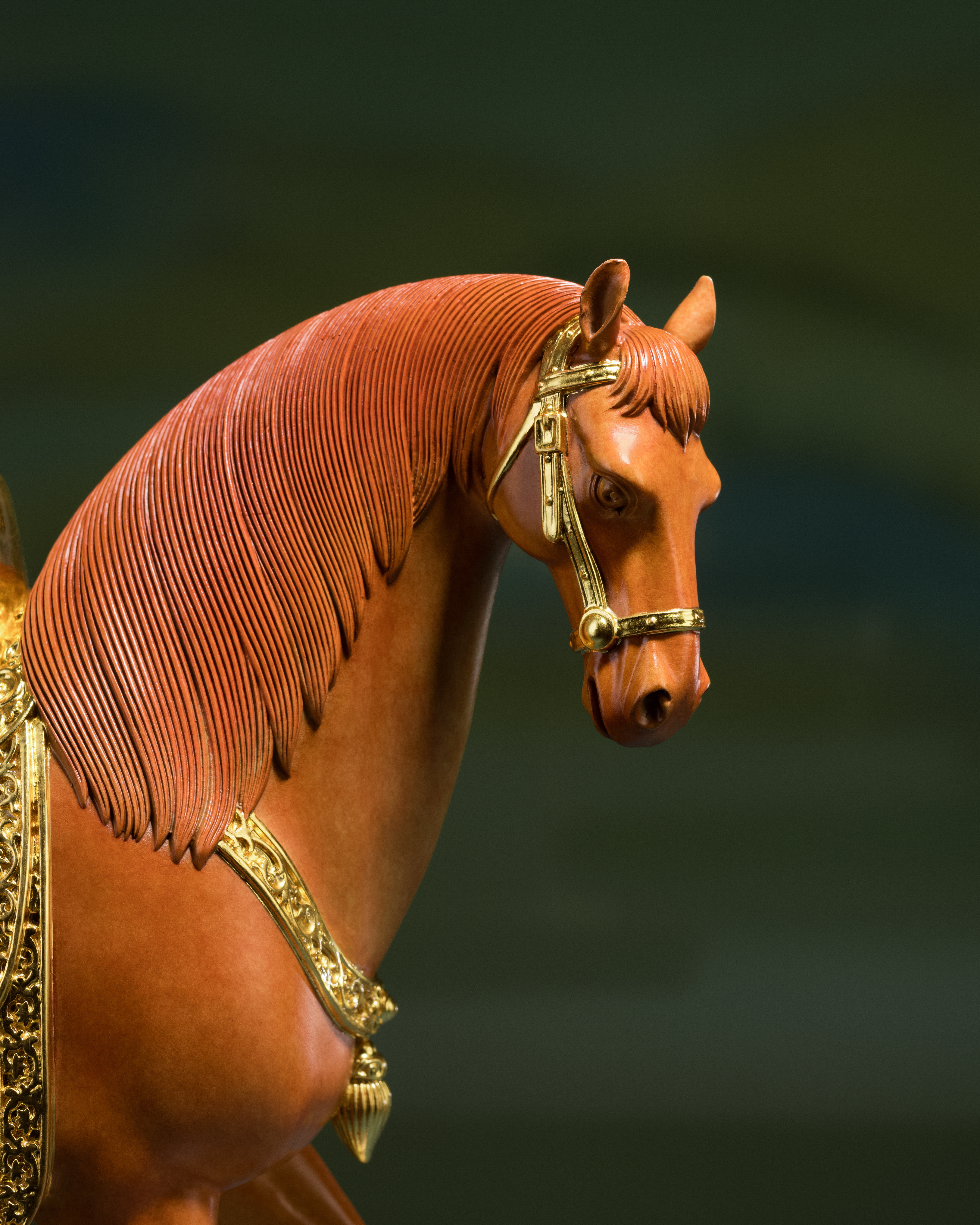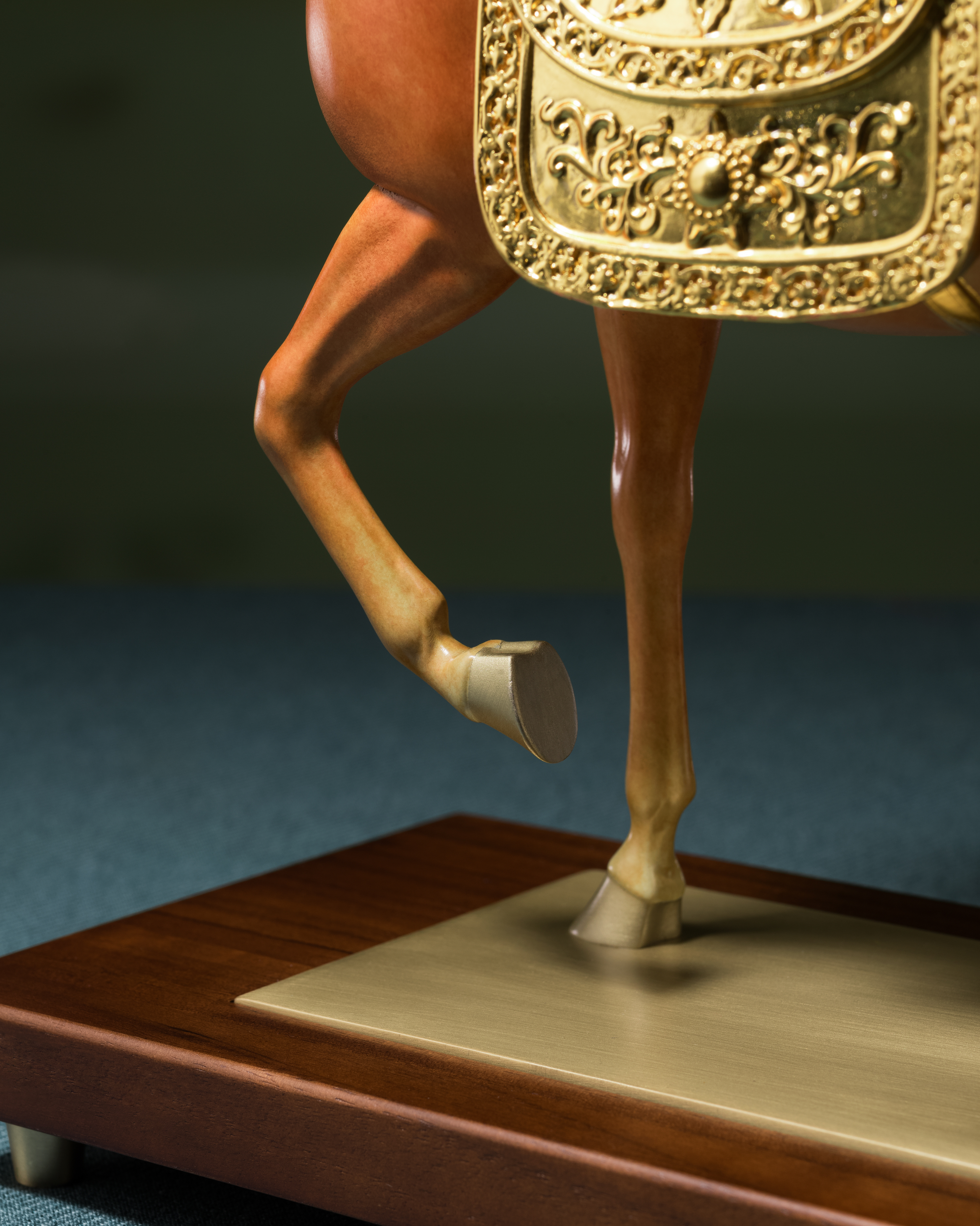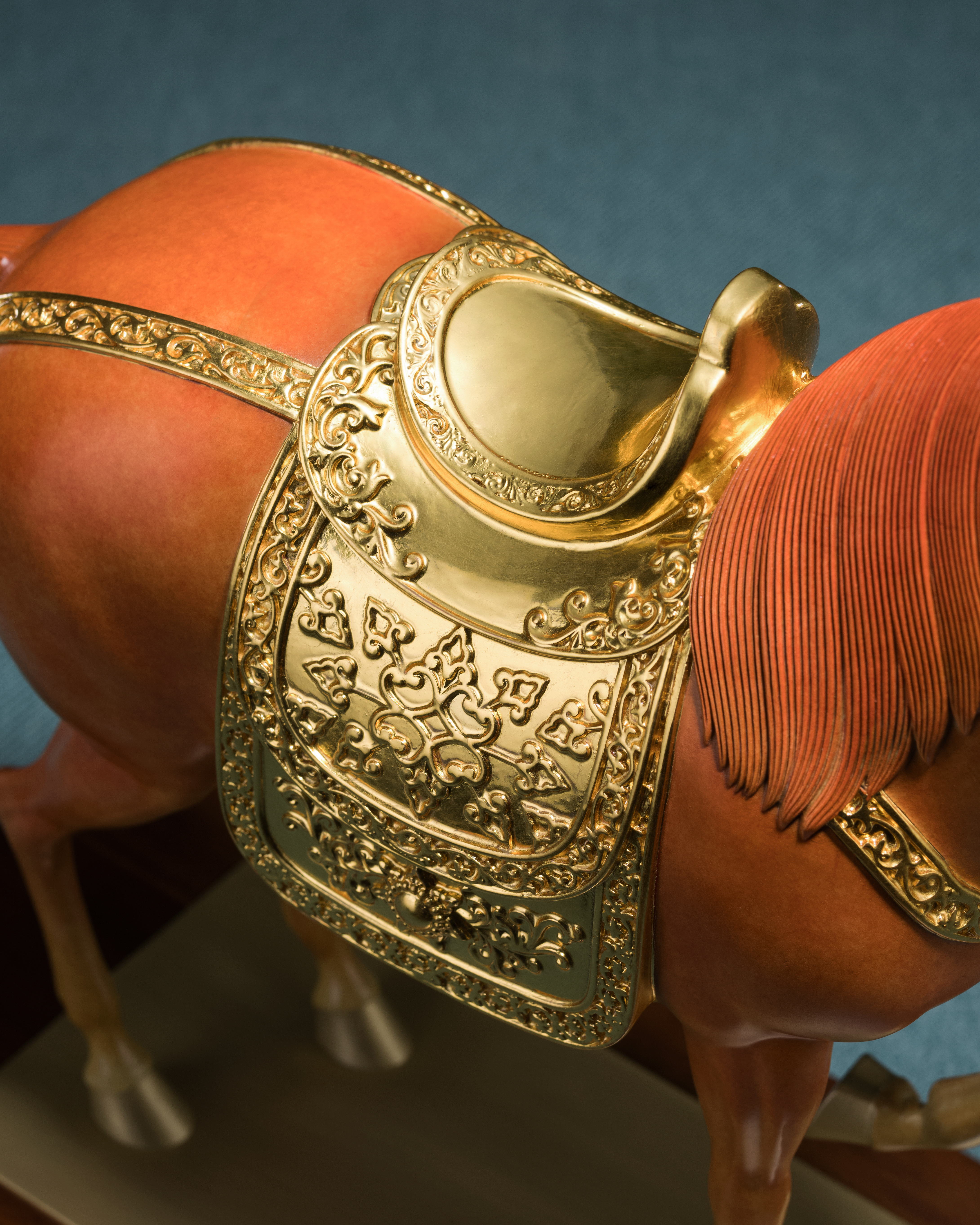 馬鞍、韁繩配件等金色部分,均以24K真金金箔貼製,搭配設計巧妙的銅腳木底座,更加精緻