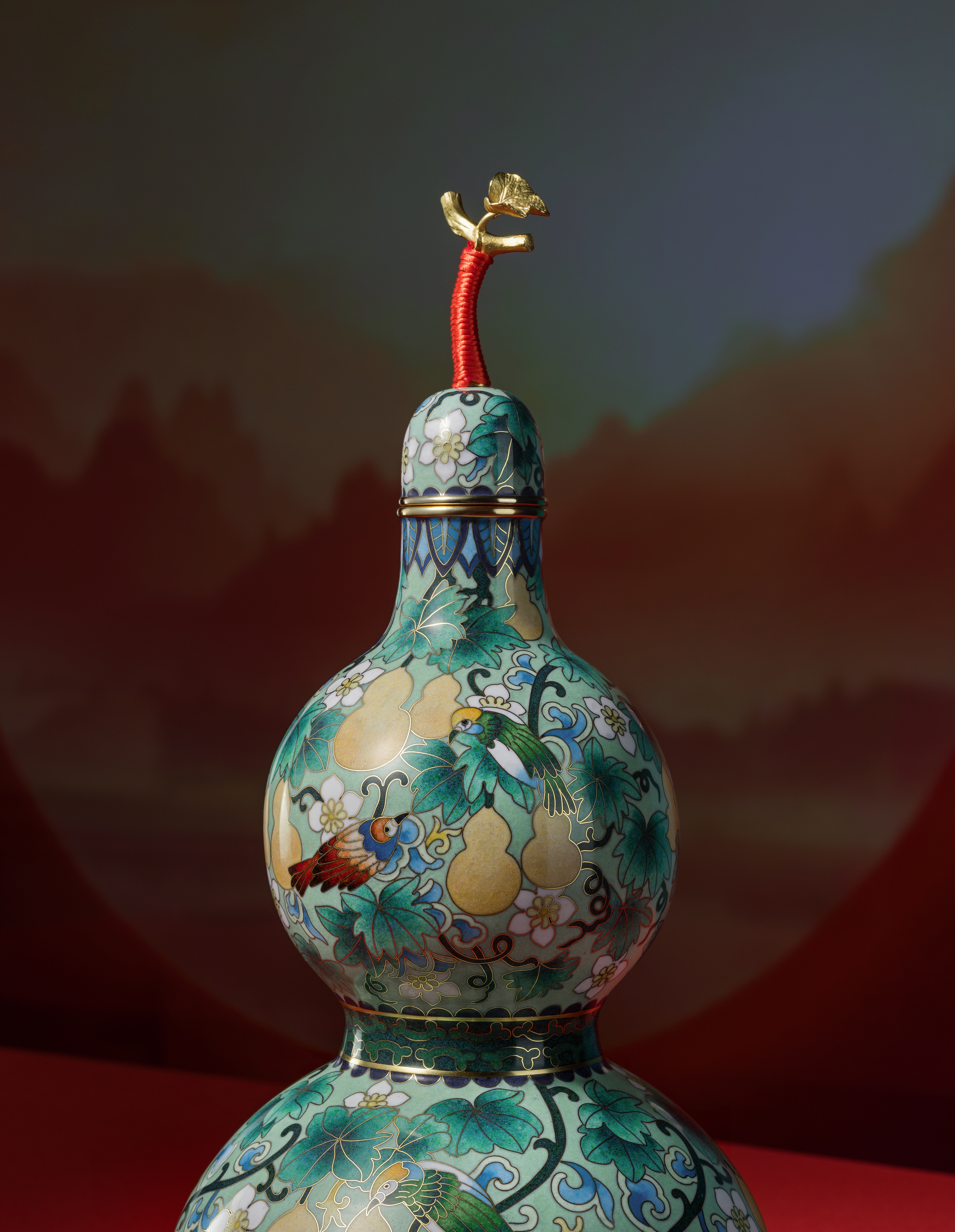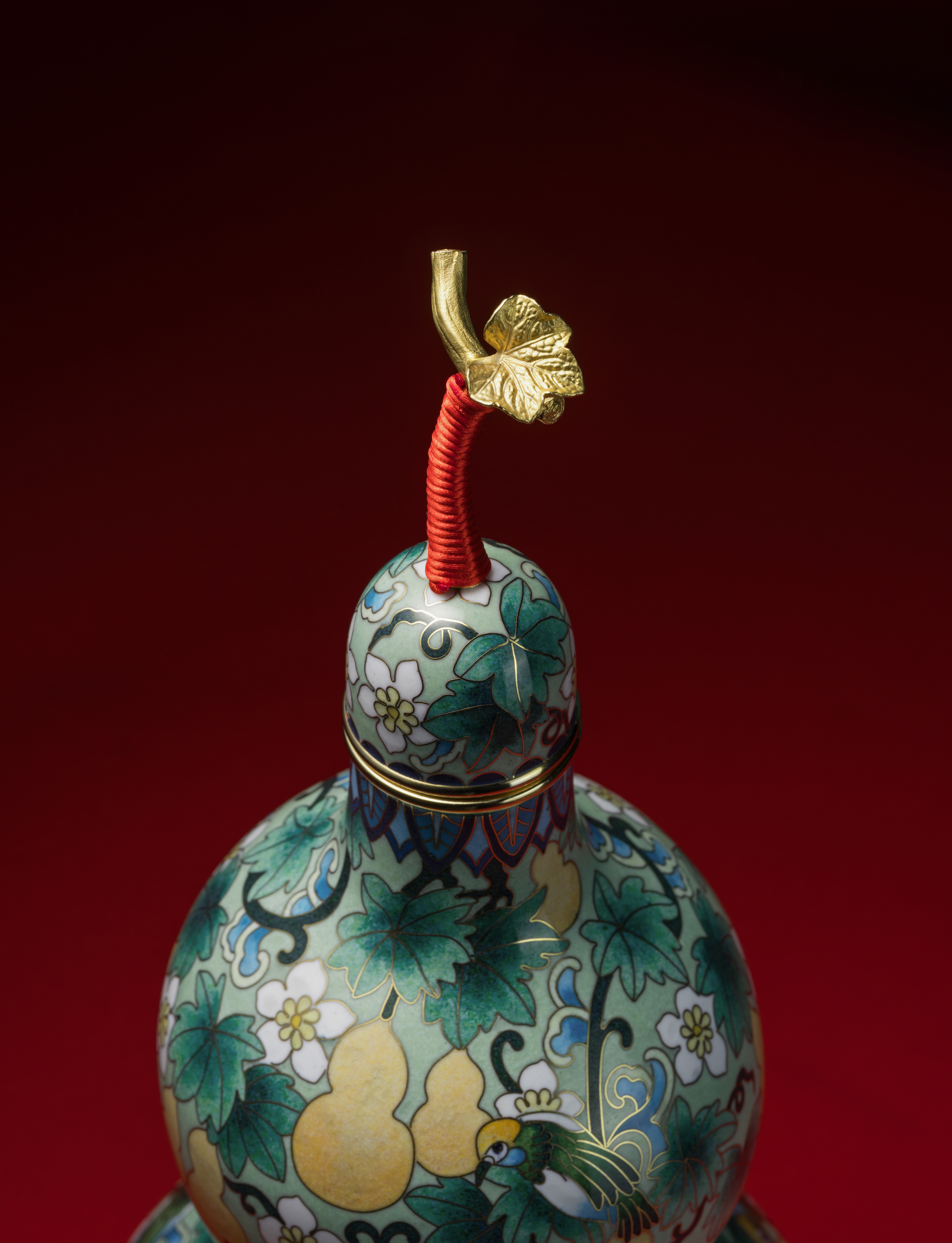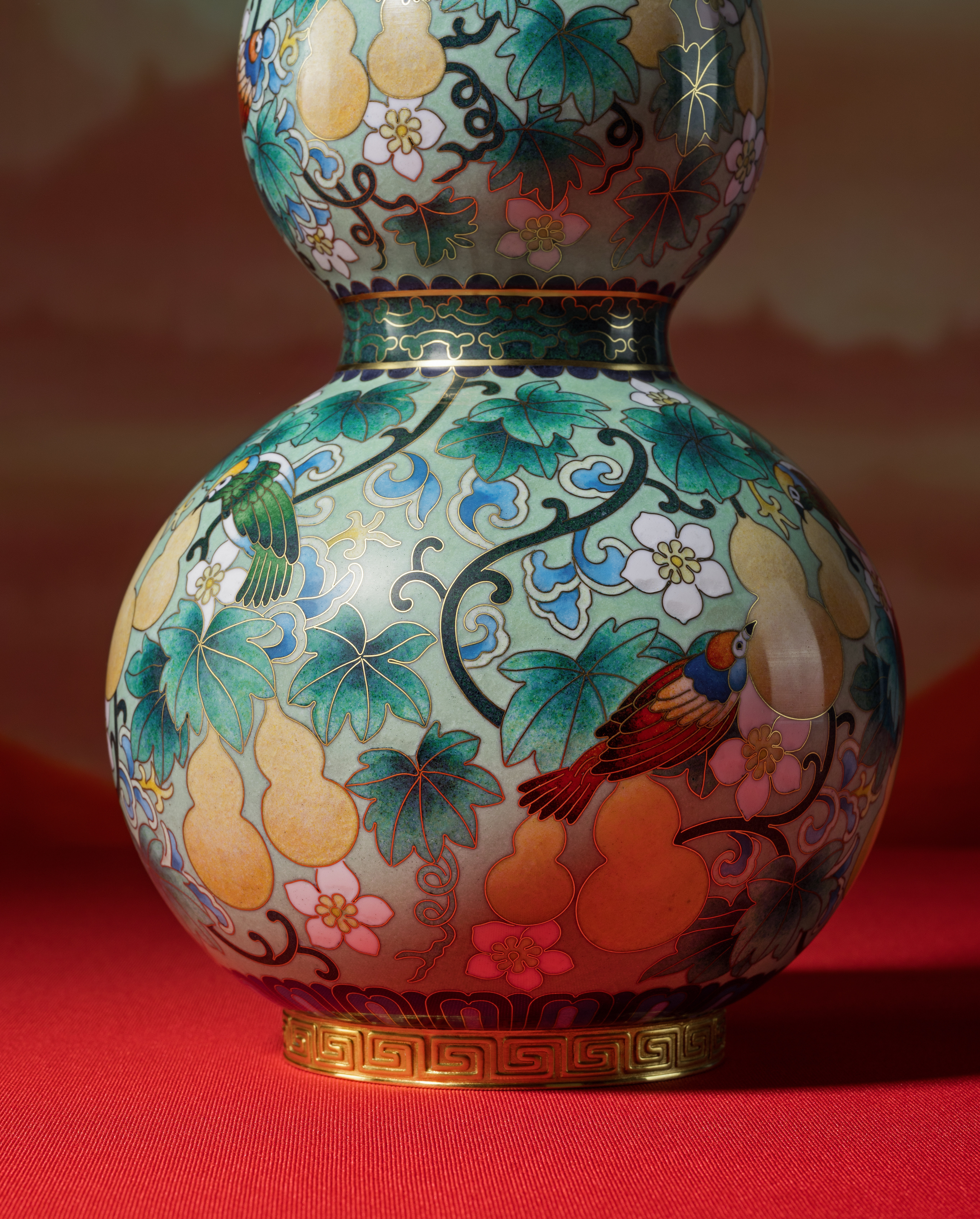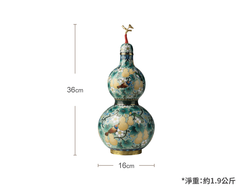 傳承自明代景泰年間的掐絲琺瑯工藝,每件作品皆以純銅胚體為底,歷經手工細膩掐絲、點藍與高溫燒釉,反覆打磨方可成器。福祿雙全在葫蘆器型上掐絲出花紋鳥飾與葫蘆造型,填色飽滿華麗、細膩典雅,展現手作溫度與景泰藍工藝收藏價值。