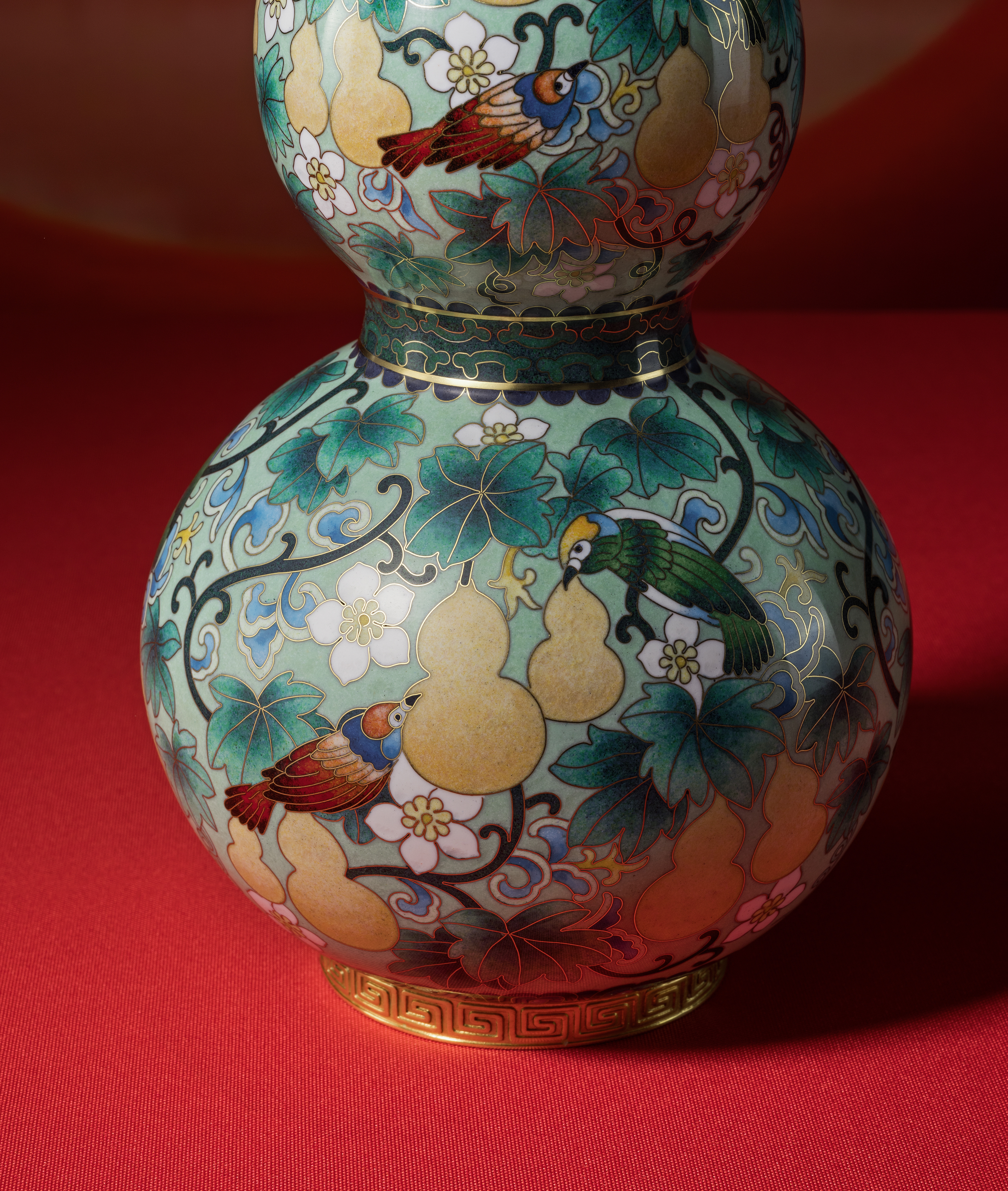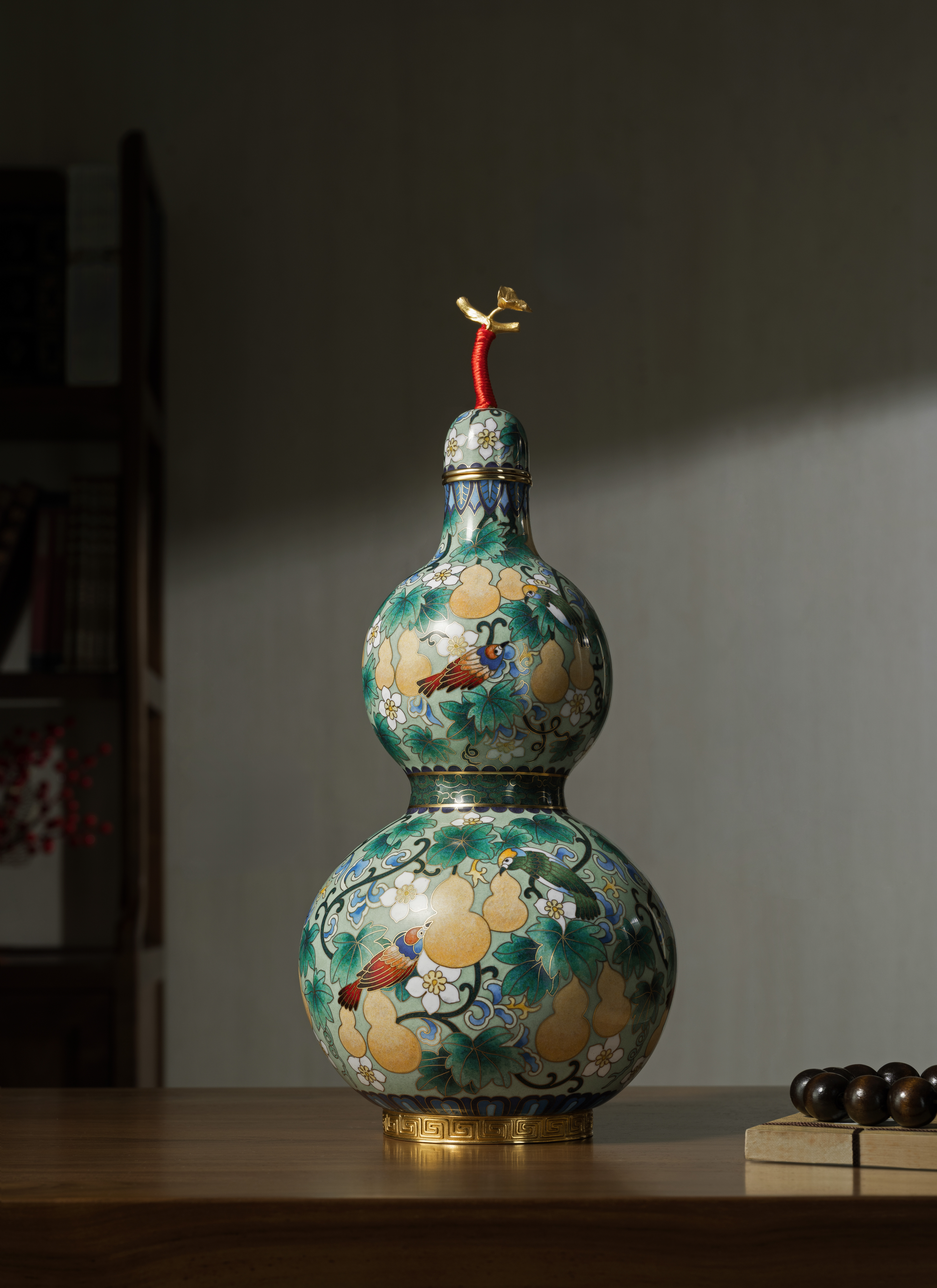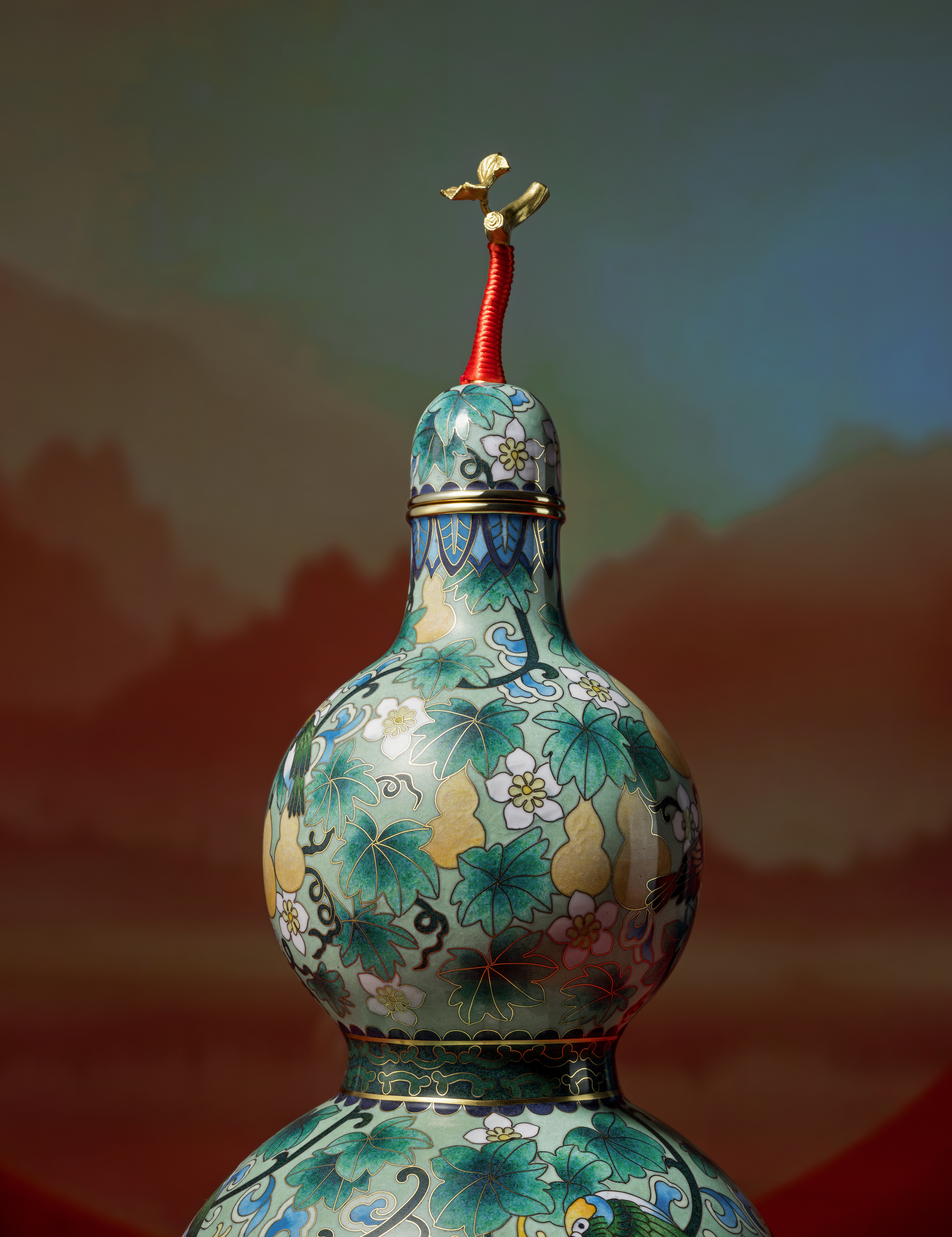 傳承自明代景泰年間的掐絲琺瑯工藝,每件作品皆以純銅胚體為底,歷經手工細膩掐絲、點藍與高溫燒釉,反覆打磨方可成器。福祿雙全在葫蘆器型上掐絲出花紋鳥飾與葫蘆造型,填色飽滿華麗、細膩典雅,展現手作溫度與景泰藍工藝收藏價值。
