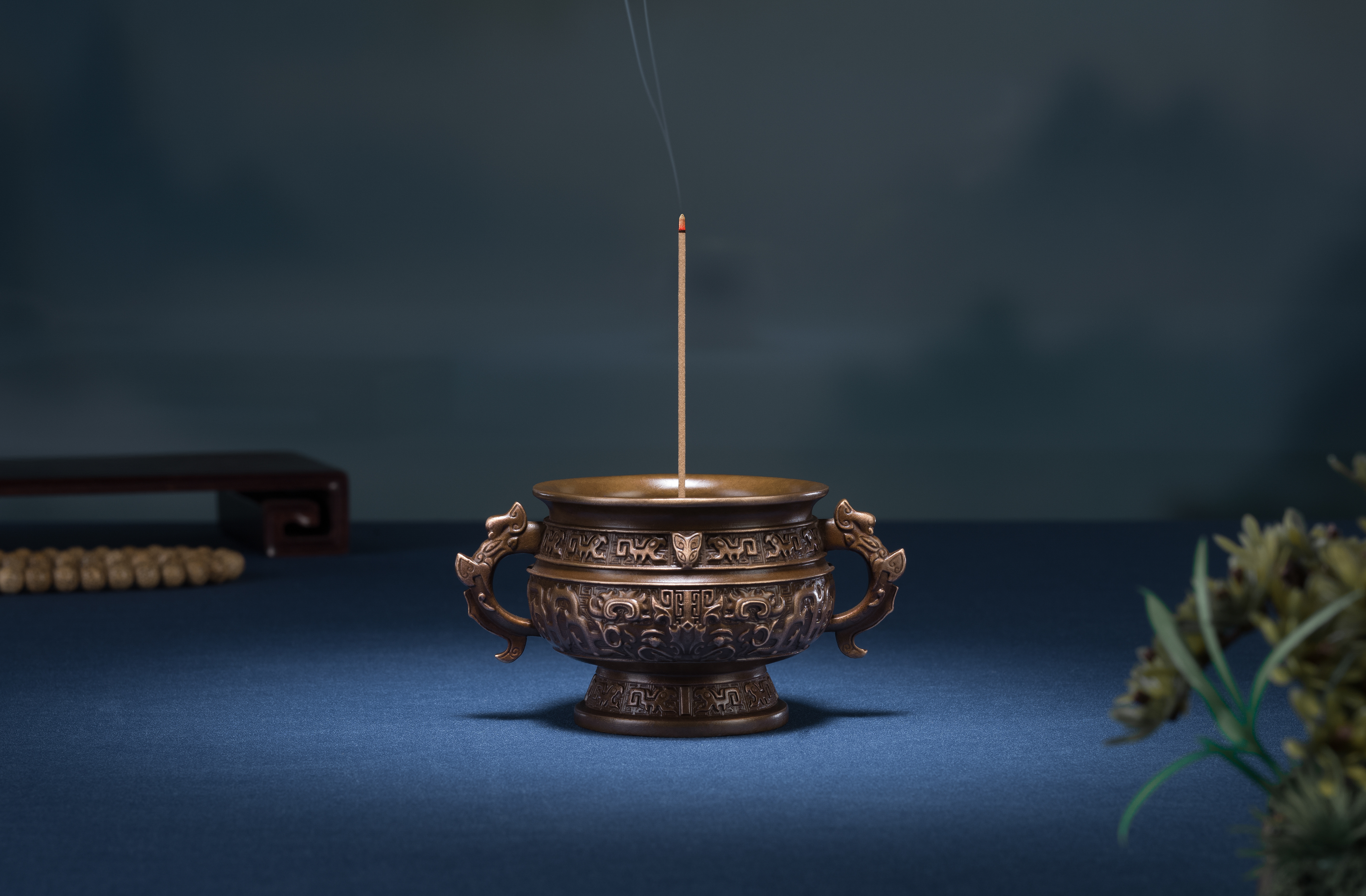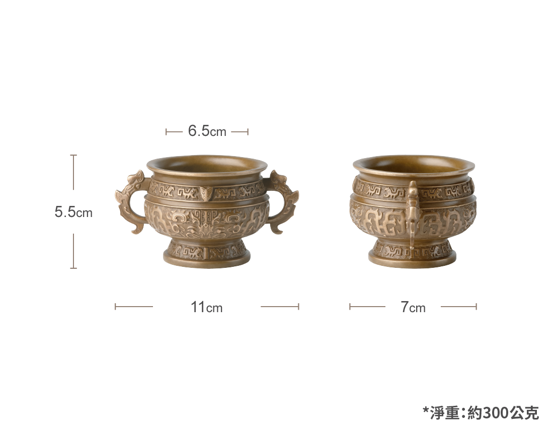 此簋式爐滿工浮雕,精妙絕倫。爐身兩側飾以氣勢磅礴的夔龍耳,頸部巧雕夔龍紋與獸首,腹部以饕餮紋裝飾,紋飾繁複細膩,盡顯古韻。全器以純銅手工製,搭配精美純銅葫蘆形香插、防火棉及一管線香,完美重現明代宮廷文化的典雅風範